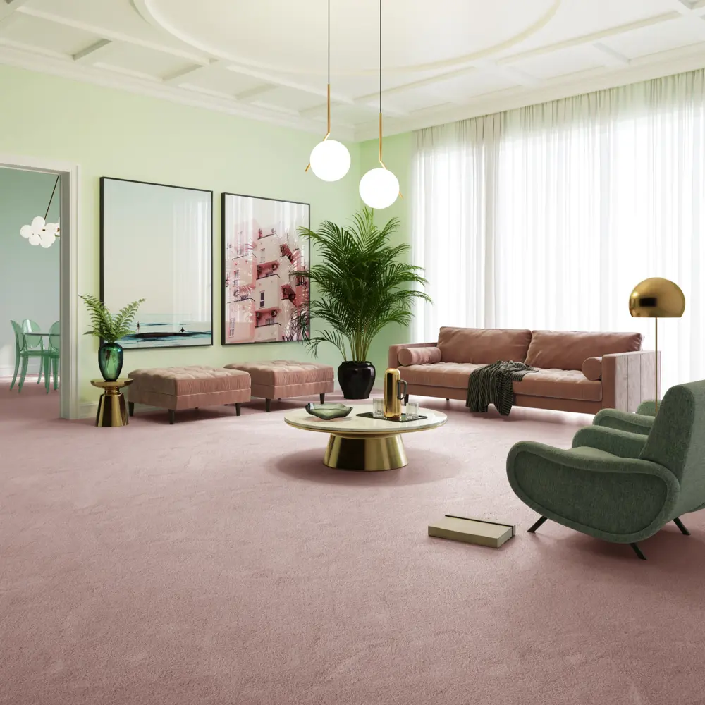 Der Teppichboden präsentiert sich in einem ansprechenden violetten Farbton, der Ihren Räumen einen eleganten und luxuriösen Touch verleiht. Der Stil Kräuselvelour sorgt für eine weiche und angenehme Oberfläche.