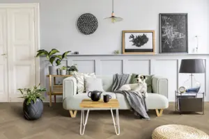 Der PVC-Boden hat eine beeindruckende Garantie von 15 Jahren im privaten Bereich und ist bekannt für seine textile Rückenstruktur. Die Eleganz des Dekors „AZAY GOLD" bringt einen Hauch von Luxus in jeden Raum.