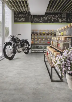 Der Boden überzeugt durch seine Robustheit und sein modernes Design in Grau. Mit einer Brandschutzklasse von C fl - s1 und einer Rutschhemmung von R10 bietet er Sicherheit und Stabilität.