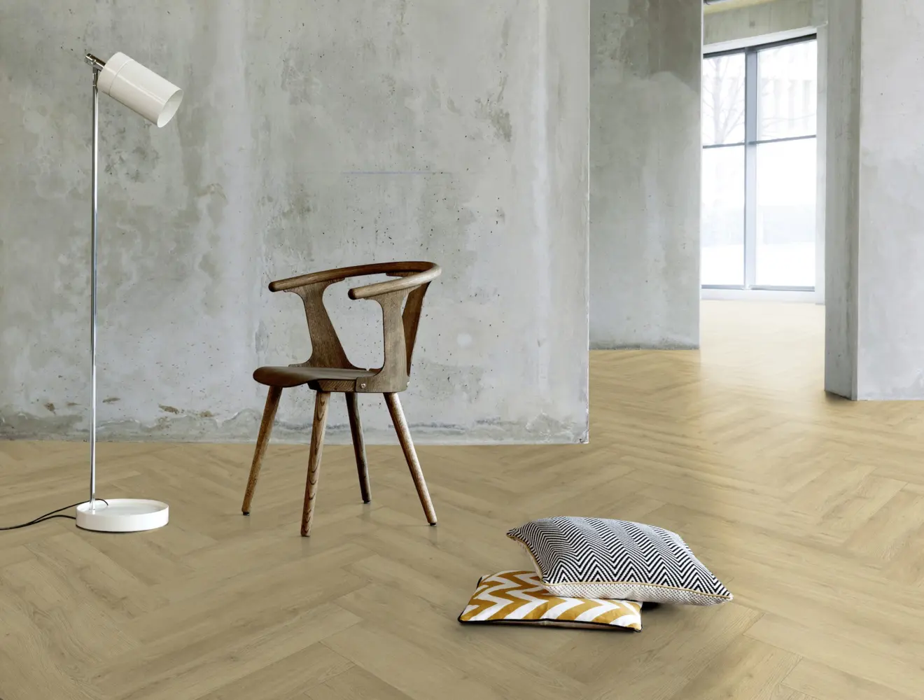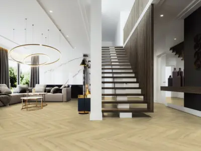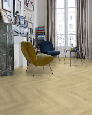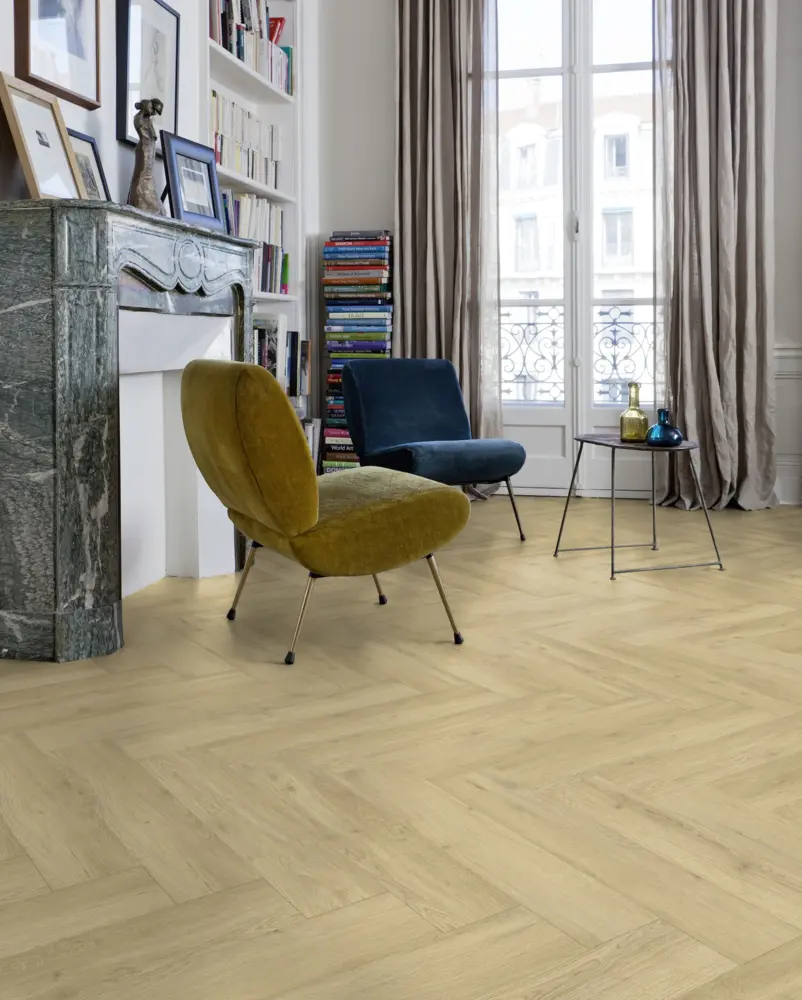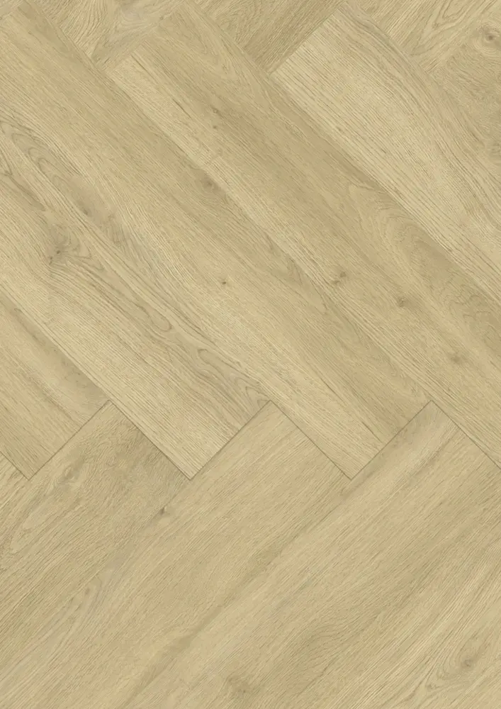 Die Planken haben ein Format mit den Maßen 152 mm Breite und 762 mm Länge, mit einer Höhe von 2,5 mm. Eine vierseitige V-Fuge und der rustikale Fischgrät-Stil unterstreichen die besondere Optik. Mit einem Rutschhemmwert von R10 ist der Fußboden zudem sicher und bietet Trittschallschutz.