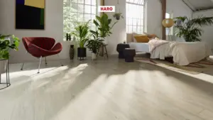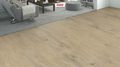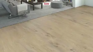 Der HARO DISANO WaveAqua zeichnet sich durch einen stabilen AquaReject Rigid-Board-Träger aus. Der Boden ist für die Verlegung auf Warmwasser-Fußbodenheizung bei bis zu 27°C Oberflächentemperatur geeignet. Mit einer Stärke von 8 mm sorgt er zudem für einen angenehmen Trittkomfort und eine Trittschalldämmung von etwa 18 dB. Die vierseitige Fase und das authentische Oberflächendesign erzeugen einen hochwertigen, modernen Eindruck.