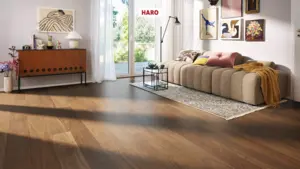 Die HARO Landhausdiele im Format 2200 x 180 mm überzeugt durch ihre raffinierte Verarbeitung und das harmonische Holzbild. Mit der lebhaften Sortierung erhält jeder Boden einen einzigartigen Charakter. Das Parkett der Serie 4000 vereint zeitlose Optik mit höchster Funktionalität.