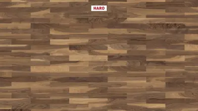 Der Parkettboden HARO Serie 4000 Stab Allegro Am. Nussbaum Favorit nD verbindet zeitlose Eleganz mit moderner Technik. Das hochwertige 2-Schicht Parkett überzeugt durch sein attraktives Schiffsboden-Design und die natürliche Schönheit des amerikanischen Nussbaumholzes. Die lebhafte Sortierung "Favorit" betont die individuelle Maserung und verleiht jedem Raum eine charaktervolle Note.