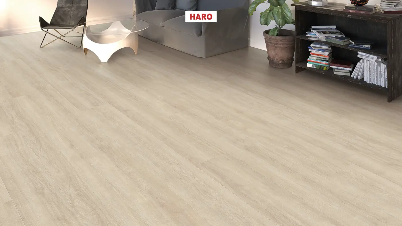 Der Haro Tritty 100 Gran Via 4V Eiche Eleganza cremeweiß Laminatboden (Artikelnummer: 541518) bietet eine helle Holzoptik in einem eleganten Eiche Dekor, welches jedem Raum eine ruhige und stilvolle Atmosphäre verleiht. Dieser Bodenbelag vereint Qualität und Design und ist ideal für verschiedenste Einsatzbereiche.
