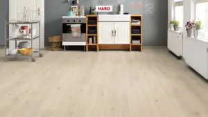 Der HARO Tritty 100 Gran Via 4V Silent Pro Laminatboden in Eiche Contura steingrau überzeugt durch seine authentische Holzoptik und eine moderne, matte Oberflächenstruktur. Mit seinem eleganten Braunton und der ruhigen Landhausdielen-Optik schafft dieser Boden ein stilvolles und zugleich behagliches Wohnambiente.