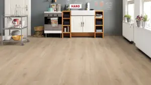 Der HARO Tritty 100 Laminatboden bietet eine integrierte Dämmschicht und zeichnet sich durch sein ruhiges Erscheinungsbild und das helle Dekor "Eiche Veneto crema" aus. Geeignet für den privaten und gewerblichen Bereich, überzeugt er mit seiner Landhausdielen-Optik.