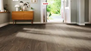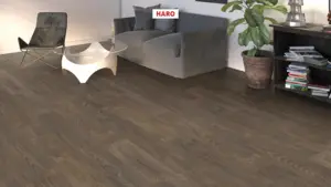 Entdecken Sie den HARO Tritty 100 Laminatboden in der Ausführung Landhausdiele 4V Akazie Vario, geeignet für vielfältige Einsatzbereiche von Gewerbe über Homeoffice bis zu Wohnzimmern.