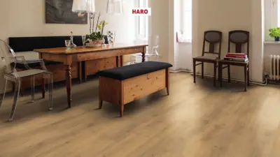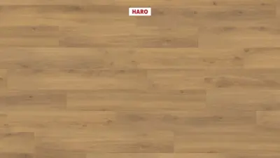 Entdecken Sie den HARO Tritty 100 Laminatboden, versehen mit einer integrierten Dämmung und einem exquisiten Dekor in Eiche Emilia Honig. Dieser Bodenbelag kombiniert hervorragende Funktionalität mit ästhetischem Design, ideal sowohl für private als auch gewerbliche Räume.
