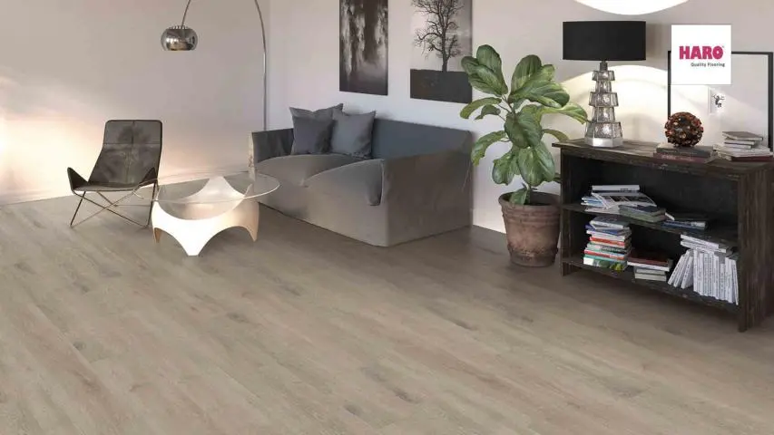 Der HARO Tritty 100 Landhausdiele 4V Silent Pro in der Ausführung Eiche Veneto Mocca ist ein hochwertiger Laminatboden mit integrierter Dämmung. Diese Landhausdiele präsentiert sich in einer eleganten Holzoptik und weist eine ruhige Erscheinung auf, die sich ideal für verschiedene Wohnbereiche eignet, darunter Gewerbe, Homeoffice, Küche, Schlafzimmer und Wohnzimmer.