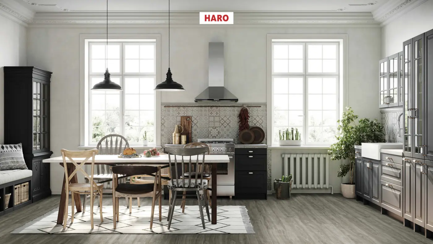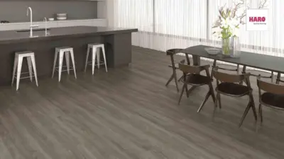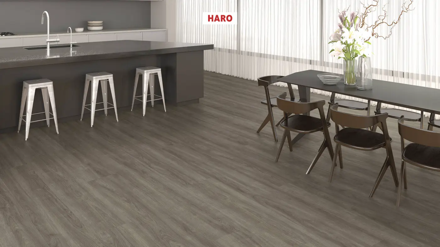 Entdecken Sie den hochwertigen Laminatboden HARO Tritty 200 AQUA Gran Via 4V in der eleganten Dekor-Optik Eiche Eleganza antikgrau. Dieser Bodenbelag vereint Stil und Funktionalität auf einzigartige Weise.