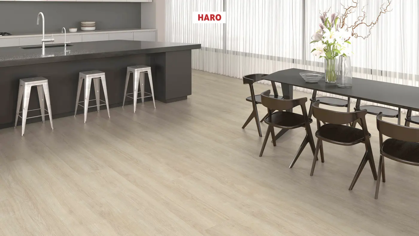 Erleben Sie den eleganten Laminatboden HARO Tritty 200 AQUA Gran Via 4V Silent CT in der Ausführung Eiche Eleganza cremeweiß. Mit der Herstellernummer 541600 präsentiert HARO einen Bodenbelag, der mit integrierter Dämmung und hervorragender Eignung für verschiedene Wohnbereiche überzeugt.