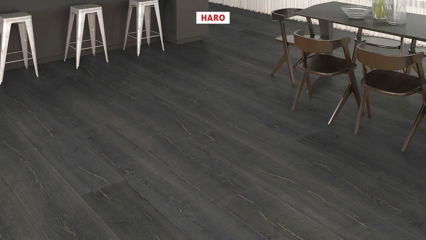 Erleben Sie den eleganten Laminatboden HARO Tritty 200 AQUA in der Farbe Eiche Metallic schwarz. Dieser Bodenbelag überzeugt nicht nur mit seiner ansprechenden Holzoptik, sondern auch durch seine technischen Eigenschaften.