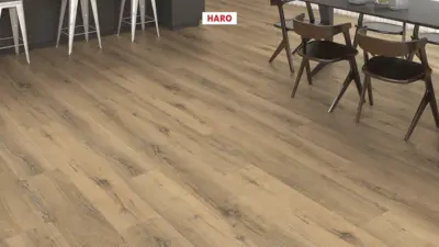 Erleben Sie mit dem HARO Tritty 200 AQUA Landhausdiele 4V Eiche Metallic natur hochwertigen Laminatboden in eleganter Holzoptik. Das außergewöhnliche Dekor „Eiche Metallic natur“ in einem hellen Beigeton verleiht jedem Raum ein freundliches, modernes Ambiente. Die lebhafte Maserung sorgt für eine natürliche und lebendige Raumwirkung.