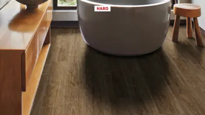 Der HARO Tritty 200 AQUA Laminatboden, im Design Eiche Eleganza geräuchert, kommt mit integrierter Dämmung und bietet ein luxuriöses Erscheinungsbild. Diese Landhausdiele überzeugt durch ihre Mittelbraun-Tönung in Holzoptik, die jedem Raum eine ruhige, elegante Atmosphäre verleiht.