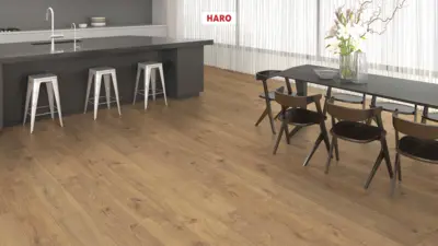 Der Boden verfügt über eine integrierte, leistungsstarke Trittschalldämmung, wodurch eine angenehme Raumakustik erzielt wird. Dank der antistatischen Eigenschaften und des Top Connect Klick-Systems gestaltet sich die Verlegung unkompliziert und effizient. Der HARO Laminatboden ist sowohl für Fußbodenheizung als auch für den Einsatz in Feuchträumen wie Badezimmer und Küche geeignet.