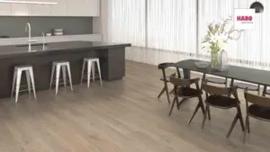 Der HARO Tritty 200 AQUA Landhausdiele 4V Silent Pro in der Dekorfarbe Eiche Veneto crema bietet eine stilvolle und praktische Lösung für jeden Raum. Dieser Laminatboden überzeugt mit seiner integrierten Trittschalldämmung und ist ideal für Menschen, die Wert auf eine ruhige und friedliche Wohnatmosphäre legen.