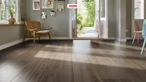 Entdecken Sie den HARO Tritty 90 Laminatboden in Nussbaum Cesano. Dieser hochwertige Bodenbelag ist mit einer integrierten Dämmung ausgestattet und verbindet ansprechendes Design mit praktischen Eigenschaften.
