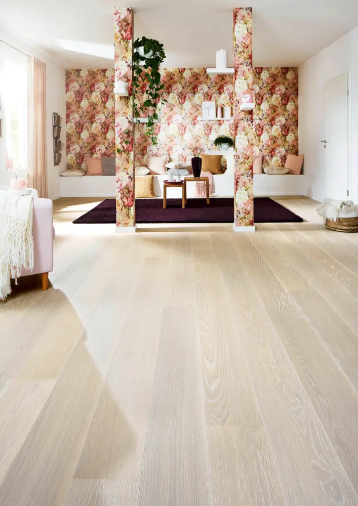 Der Joka 527 Calgary LD 138 Parkettboden in der Ausführung Eiche nova gebürstet V2 steht für natürliche Eleganz und hochwertigen Wohnkomfort. Die Landhausdiele überzeugt durch ihre helle, weiß geprägte Optik und bringt eine lebhafte, natürliche Ausstrahlung in jeden Raum. Die lackierte Oberfläche sorgt für Langlebigkeit und einfache Pflege, während die gebürstete Struktur die Holzmaserung besonders zur Geltung bringt.