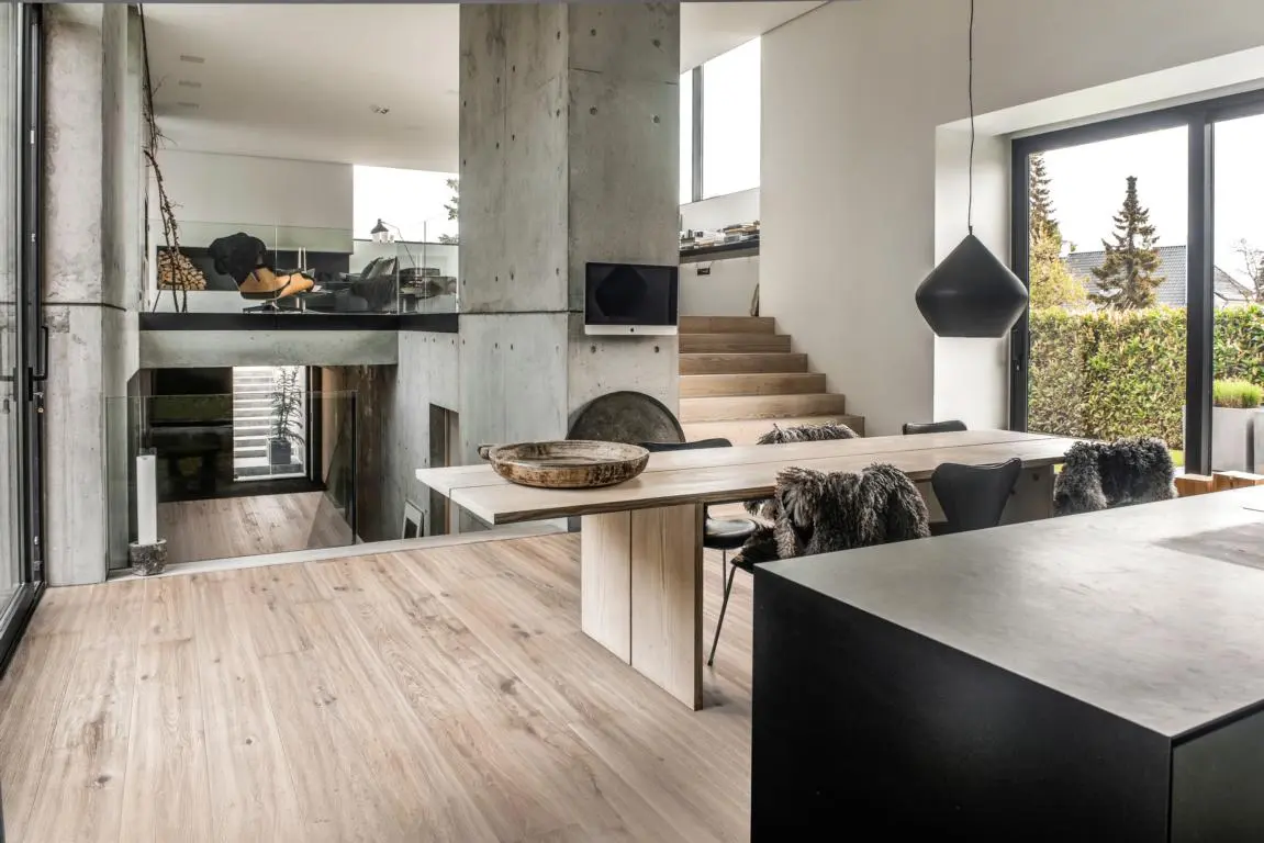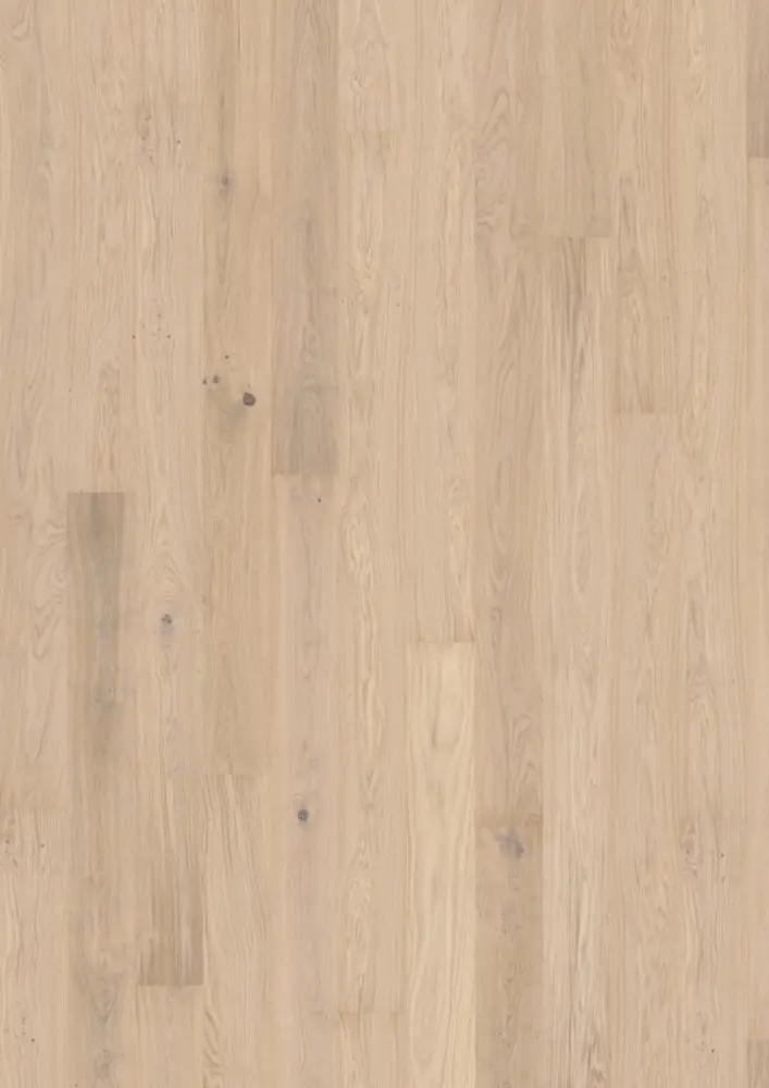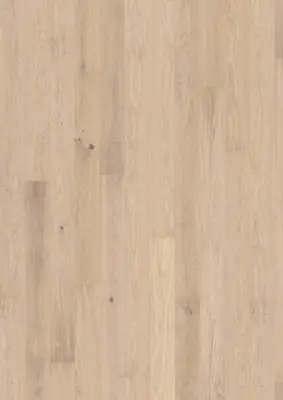 Das Parkett besteht aus robustem Eichenholz und ist dreischichtig aufgebaut. Die ultramatt-lackierte, gebürstete Oberfläche sorgt für einen authentischen Charakter und angenehme Haptik. Die vierseitige Fase unterstreicht die Dielenoptik und betont das großzügige Format von 2420 mm Länge und 187 mm Breite.