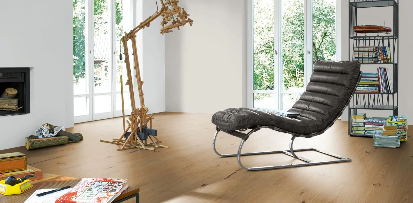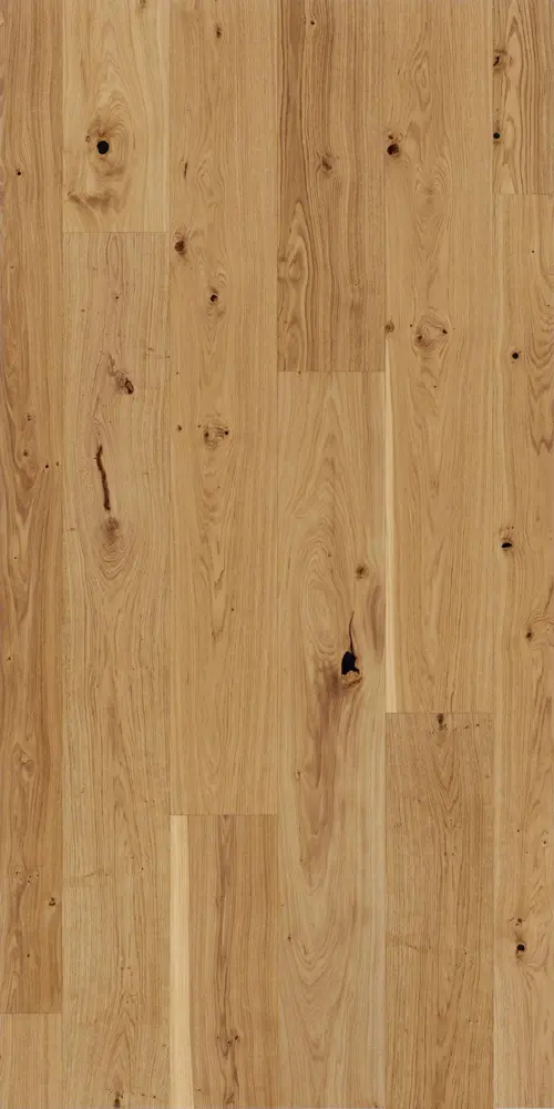 Dank ihres mehrschichtigen Aufbaus bietet dieses Fertigparkett eine hohe Formstabilität. Die Nutzschicht aus europäischer Eiche sorgt für Langlebigkeit und einen warmen, natürlichen Braunton, der jeden Raum bereichert. Der Boden kann schwimmend verlegt werden und ist für Warmwasser-Fußbodenheizungen bis 27 °C geeignet. Das Format der Großdiele (2380 mm Länge, 233 mm Breite, 11,5 mm Stärke) verleiht großzügigen Räumen eine beeindruckende Wirkung. Die Oberfläche ist widerstandsfähig und pflegeleicht, sodass der Boden bestens für den Alltag geeignet ist. Die Rutschhemmung der Klasse R9 sorgt für zusätzlichen Komfort beim Begehen.