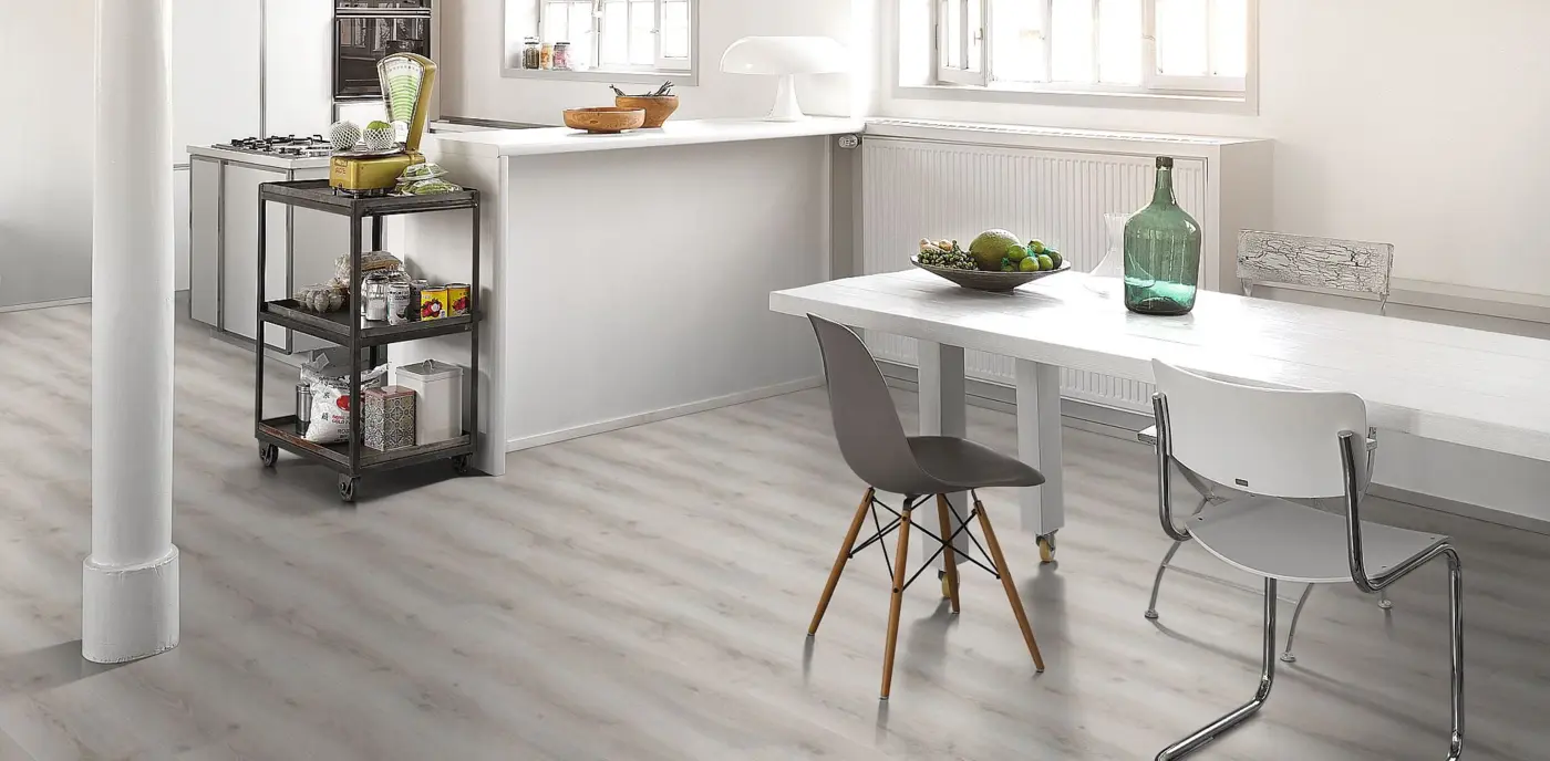 Der Parador Basic 600 Laminatboden in der Ausführung Eiche Askada weiß gekälkt mit Naturstruktur vereint edle Landhausdielen-Optik mit moderner Technik. Dank der synchron geprägten Oberfläche entsteht eine naturgetreue Eichenstruktur, die dem Raum eine helle, freundliche Atmosphäre verleiht. Das breite Dielenformat und die umlaufende 4-seitige Fase sorgen für einen harmonischen Gesamteindruck und unterstreichen den hochwertigen Charakter des Bodens.