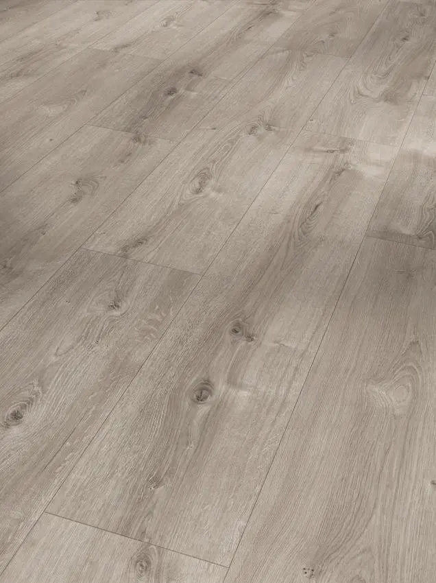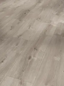 Der Parador Basic 600 Laminatboden in Eiche Valere perlgrau gekälkt vereint zeitlose Landhausdielen-Optik mit moderner Farbgebung. Die authentische Synchron-Struktur unterstreicht die natürliche Eichenoptik und sorgt für ein angenehmes Laufgefühl. Das breite Dielenformat betont das großzügige und elegante Erscheinungsbild dieses Bodens.