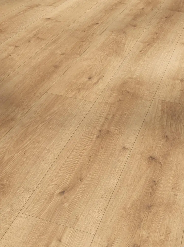 Der Parador Modular ONE Eiche Pure natur Schlossdiele Designboden überzeugt durch seine natürliche und lebhafte Eichenoptik in einem angenehmen Braunton. Die matte Holzstruktur und die 4-seitige Fase betonen das authentische Landhausdielen-Design und schaffen ein behagliches Wohnambiente.