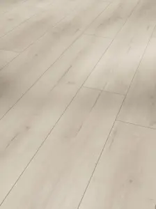 Erleben Sie mit dem Parador Trendtime 6 Eiche Loft weiß Lebhafte Struktur 4V Laminatboden einen Bodenbelag, der natürliche Eleganz mit modernen Akzenten verbindet. Das authentische Eiche-Dekor in edlem Weiß besticht durch eine lebendige Synchron-Struktur und eine 4-seitige Fuge, die den Charakter einer klassischen Landhausdiele eindrucksvoll unterstreicht. Die Oberfläche vermittelt eine angenehme Haptik, die den natürlichen Charme des Eichenholzes betont.