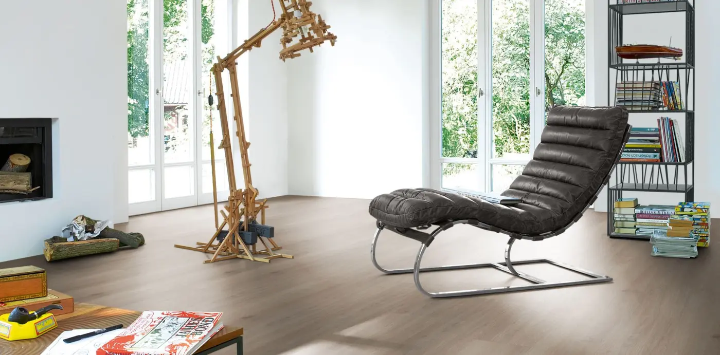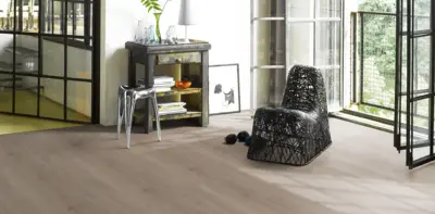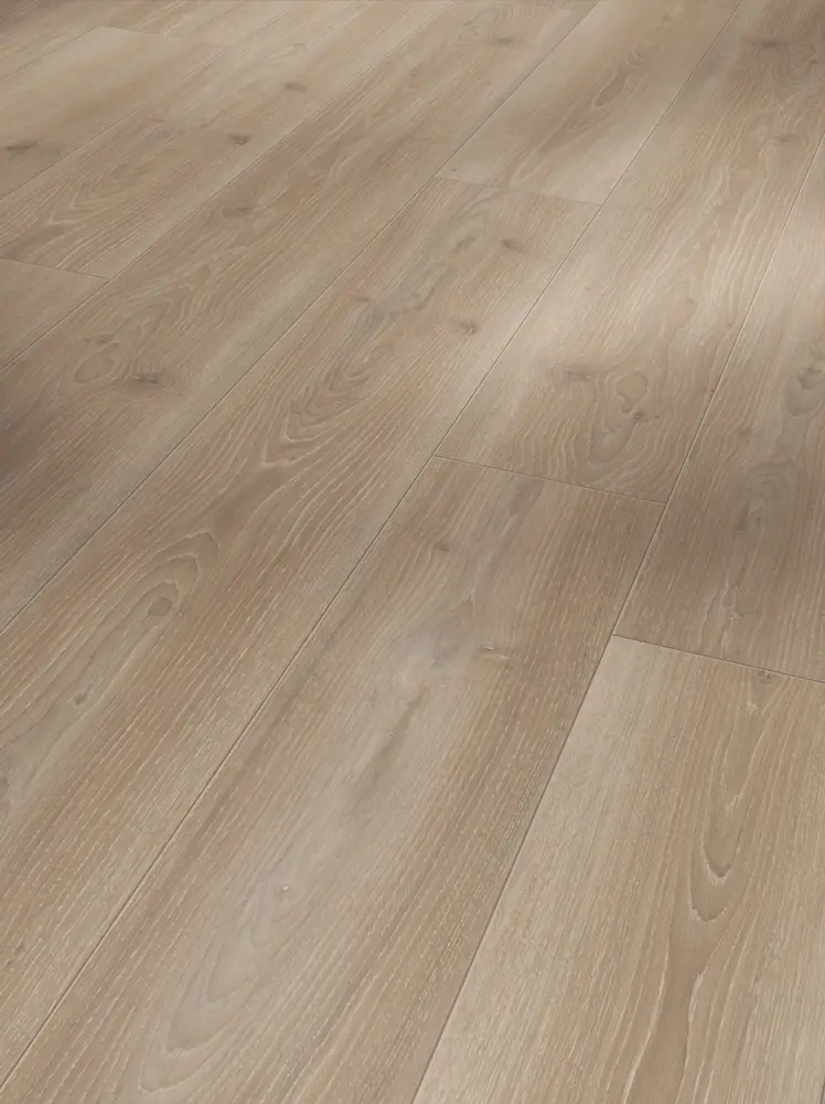 Der Parador Trendtime 6 Laminatboden überzeugt durch seine authentische Eichenoptik in Skyline perlgrau und eine naturmatte Synchron-Struktur, die ein modernes und zugleich natürliches Ambiente schafft. Mit der Landhausdiele und der vierseitigen Fase entsteht eine harmonische Flächenwirkung. Der mittelbraune Farbton sorgt für eine warme und wohnliche Atmosphäre.