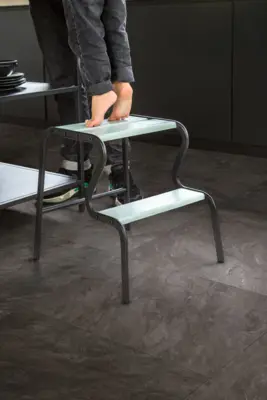 Optimiert für die Nutzung auf Fußbodenheizungen, ist der Designboden sowohl privat als auch gewerblich einsetzbar und bietet eine geprüfte Stuhlrolleneignung. Die imprägnierte Kante schützt darüber hinaus effektiv vor Feuchtigkeit und sorgt für eine langlebige Oberfläche im modernen Stein-Look.