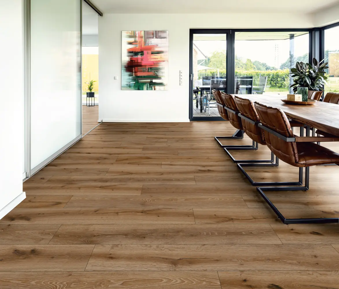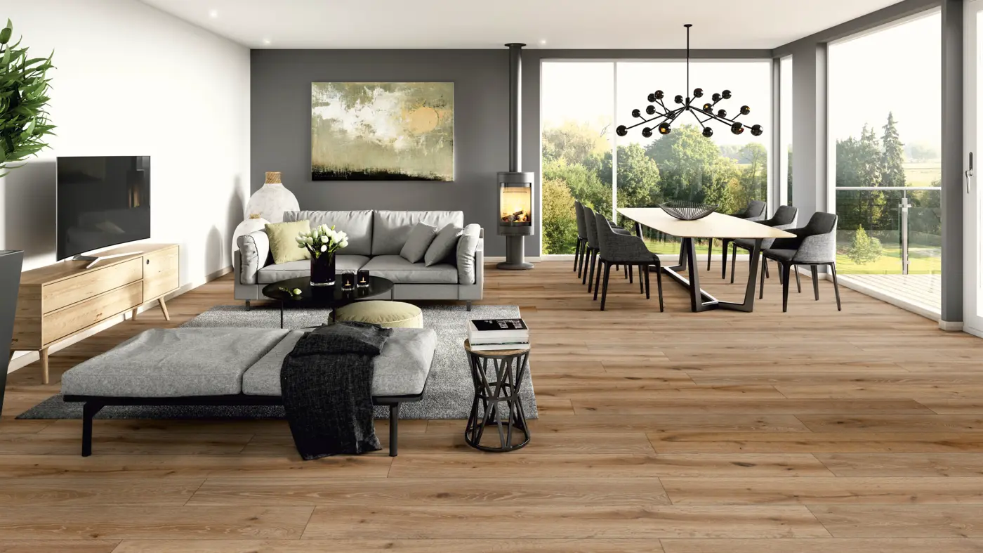 Setzen Sie mit dem ter Hürne Avatara Eiche Lyra Designboden stilvolle Akzente in Ihren Räumen und profitieren Sie von modernen technischen Eigenschaften, die Funktionalität und Ästhetik vereinen.