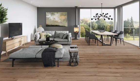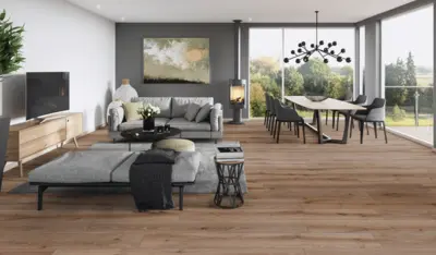 Die strukturierte Oberfläche und die 4-seitige Fase unterstreichen die Wirkung großformatiger Breitdielen und sorgen für einen authentischen Eindruck. Das Format von 1290 x 254 mm und eine Stärke von 2,5 mm machen den Boden zur idealen Wahl für Wohn- und Geschäftsbereiche.