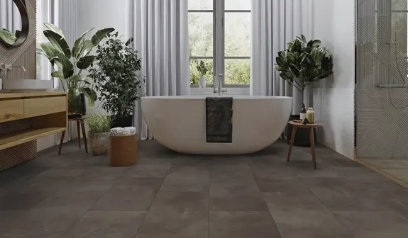 Der ter Hürne Avatara Stein Orion Designboden zum Kleben überzeugt mit einer modernen Betonoptik und einem eleganten, dunkelgrauen Farbton. Das großzügige Fliesen-Format (595 x 1190 mm) verleiht jedem Raum eine stilvolle, urbane Atmosphäre. Dank seiner vierseitigen Fase entsteht ein authentisches Fugenbild, das den Look echter Steinfliesen betont.