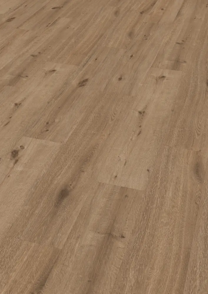 Dieser Vinylboden hat eine lebhafte Erscheinung mit einem braunen Farbton, der in fast jede Raumgestaltung integriert werden kann. Er hat eine gebürstete Oberfläche und ist mit einer Polyurethan-Versiegelung (PUR) versehen, was zusätzliche Haltbarkeit bietet. Die 4-seitige V-Fuge verstärkt das natürliche Aussehen der Breitdiele.