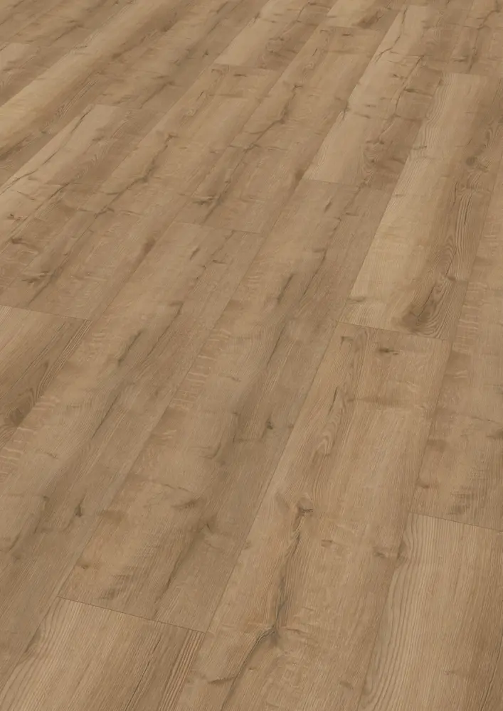 Genießen Sie die Vorteile der 4-seitigen Fase und der Rutschhemmung R10. Bitte beachten Sie, dass der Boden laut NALFA-Test nicht wasserresistent ist, jedoch mit einem widerstandsfähigen HDF-Träger ausgestattet ist.