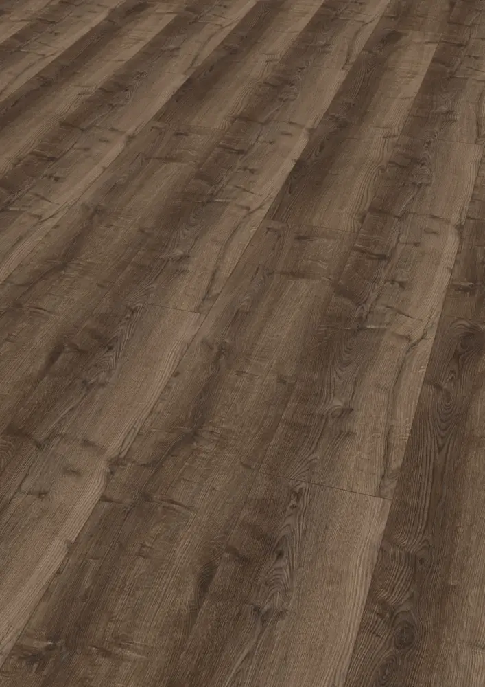 Der Boden beeindruckt durch seine dunkelbraune Farbe und die rustikale Erscheinungsbild-Stilrichtung "Landhausdiele". Die Synchronstruktur verleiht dem Boden einen authentischen Look, während die breite Dielenformat-Optik für ein großzügiges Raumgefühl sorgt. Die Stärke beträgt 9 mm und die Nutzschicht ist 0,3 mm stark.